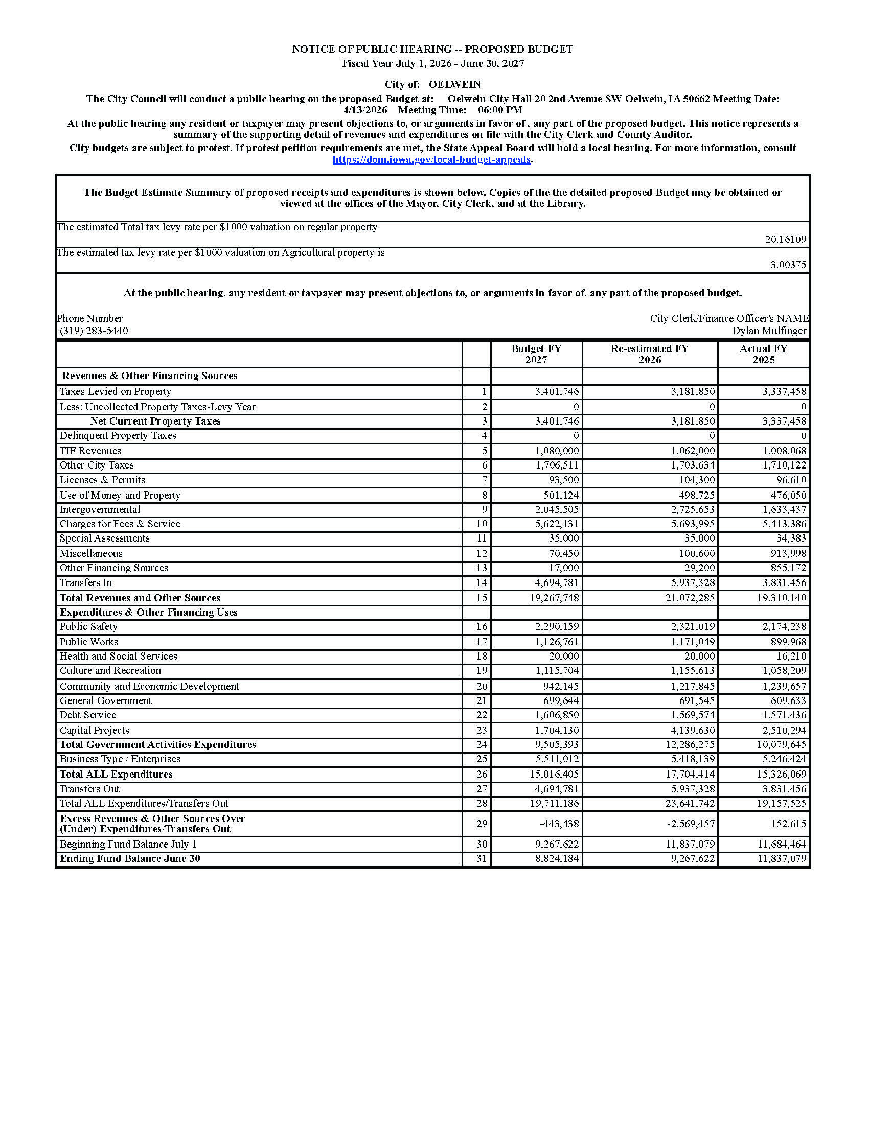 A public hearing regarding the proposed property tax levy for FY2027 is being held on March 23rd, 2026 at 5:30 pm in the City Council Chambers. Any resident or taxpayer may present objections to, or arguments in favor of the proposed tax levy. If you are unable to attend the hearing but have questions, please contact the City Hall at 319-283-5440.