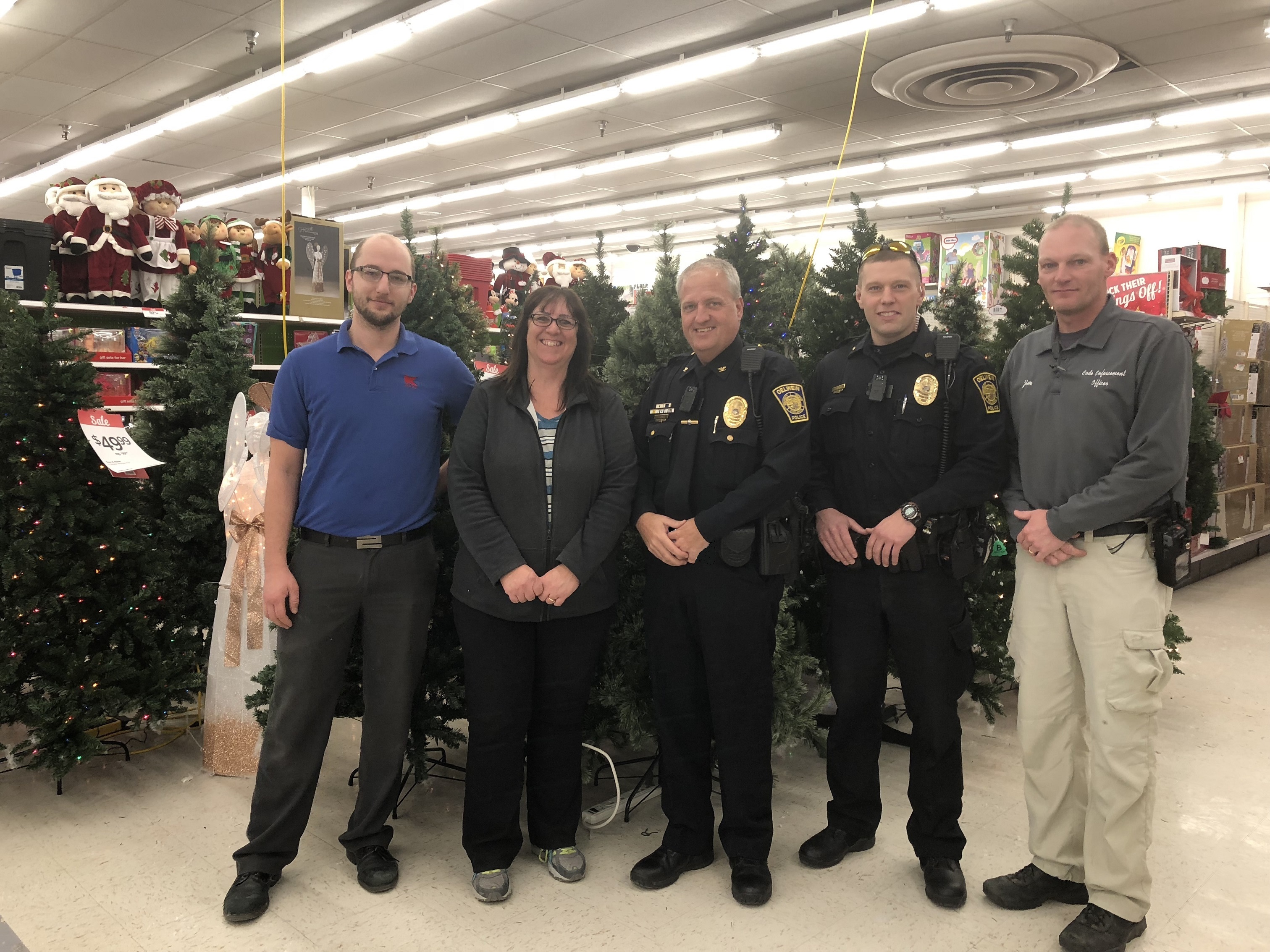 In the photo is KMart Manager Landon Glodowski and KMart Associate Kim Ruden accepting the funds from Chief Jeremy Logan, Officer Boyd Eser and Code Enforcement Officer Jim Prouty.